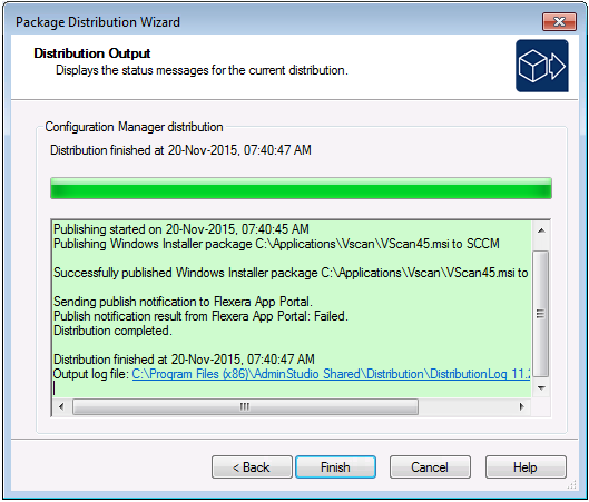 15. On the Distribution Summary panel, review the selections you made. If you are satisfied with them, click Next to distribute the package. The Distribution Output panel displays progress during distribution. When distribution is successful, the message Successfully published ... is listed and the background color of the output window turns green.