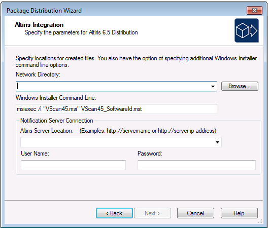 User NameEnter a User Name to log onto the server entered in the Altiris Server Location field. The Distribution Wizard remembers the last User Name that is entered and displays it the next time this panel is accessed.