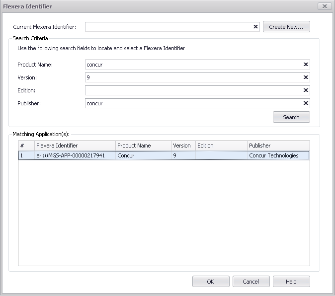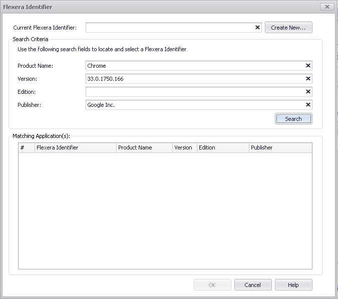 • Matching application not found—If a matching application is not listed, continue with the steps in Creating Local Flexera Identifier Entries for Internal or Repackaged Applications to create a new local Flexera Identifier.