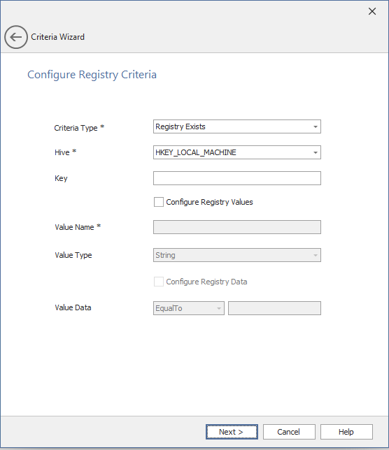 | Criteria Type | Select one of the following Criteria Type: • Registry exists • Registry does not exist |