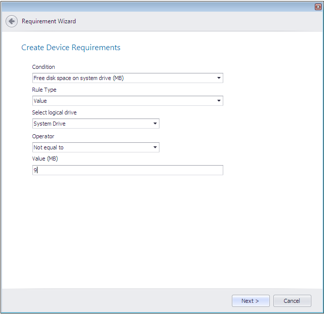 Disk space—Select a drive from the Select logical drive list and enter a value, in MBs, in the Value (MB) text box.