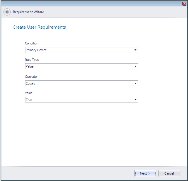 ConditionSelect a condition type from the list. For user requirements, Primary Device is the only condition type listed.
