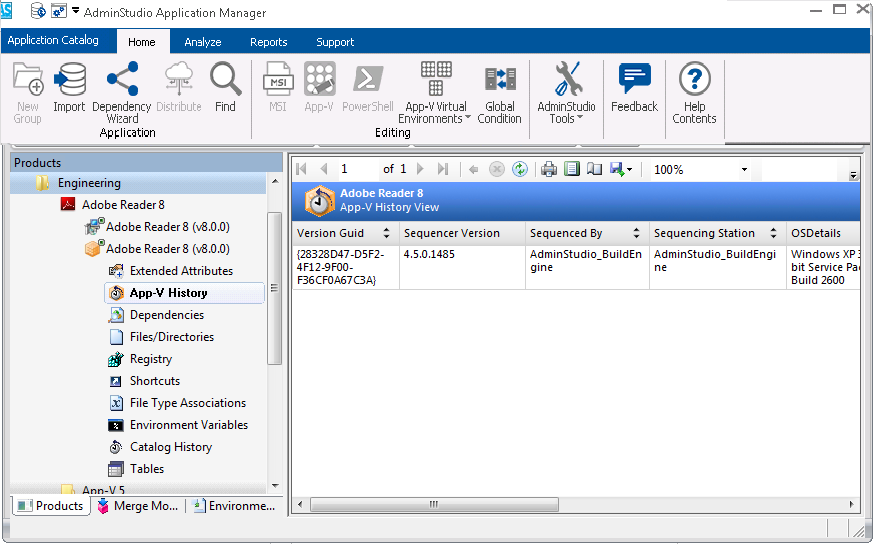 - In the tree, expand an App-V package and select the App-V History node. The App-V History View opens, listing an entry for each time this App-V package has been saved.