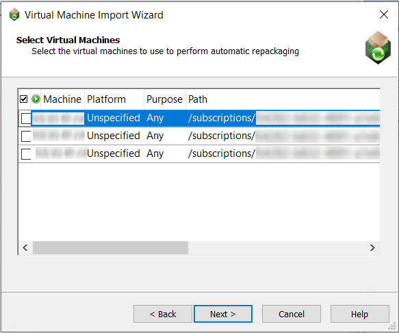 In the Select Virtual Machines panel, select the virtual machine images that you want to use to perform automated repackaging.