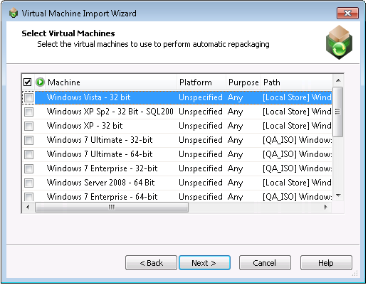 You have the option of selecting just one virtual machine to use for all repackaging, or selecting an operating system group of multiple virtual machines that can be used simultaneously to speed up the repackaging of multiple setups.